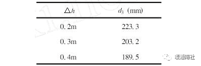 某实际工程选用两台流量为250m3/h的冷却塔,设计出水管尺寸为200mm。各参数取值如下:λ=0.037,ρ弯头=1,ρ进口=0.9,ρ弯头=0.9,ρ蝶阀=0.5,平衡管计算流量取125m3/h。△h分别取0.2m,0.3m,0.4m进行模拟计算,结果如表1。