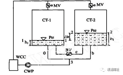 图中,MV为电动蝶阀,在某一台机组停止运行时,起关断作用。BV为手动蝶阀,平时开启,检修时起关断作用。CWP为冷却水泵,WCC水冷机组。