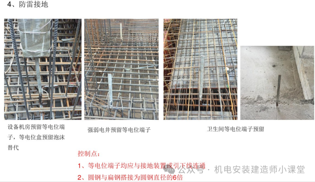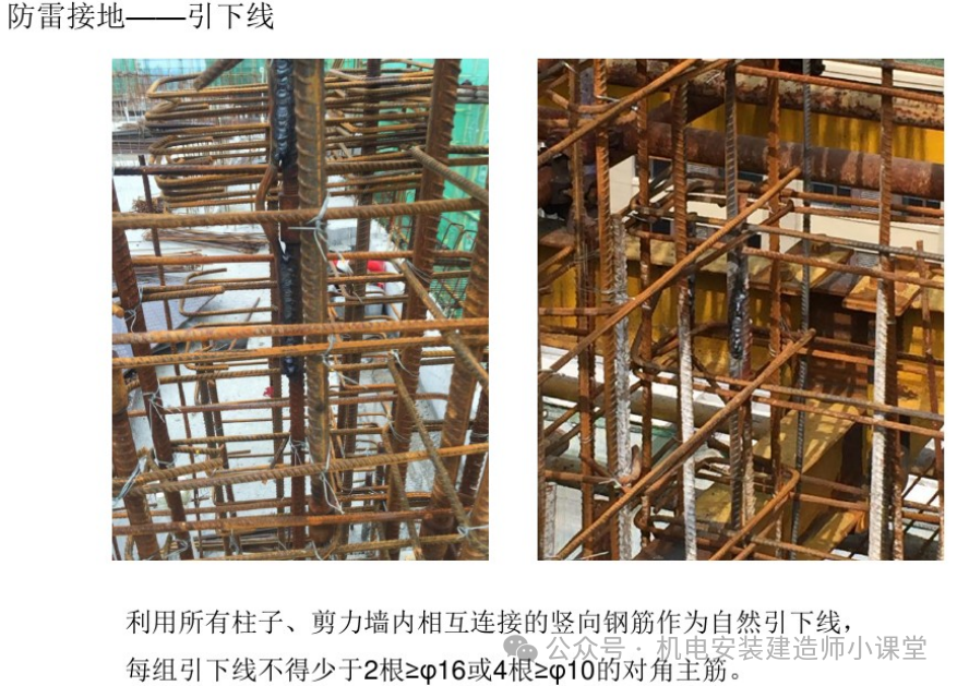 (2)对以柱筋为引上线的接地网,要求施工人员采用每层按轴线标清每根柱子的位置及钢筋焊接根数进行施工,防止漏焊或错焊位置,焊接长度及质量不满足设计及规范要求等。监理要对引上点和跨钢筋焊接质量仔细检查,并要求对焊接引上线进行定位标识,以防向上层焊错主筋,造成接地中断错误。特别是对于结构的转换层,由于柱筋的调整,防雷引下线利用柱内主筋焊接引下容易错焊、漏焊,要进行反复核实。