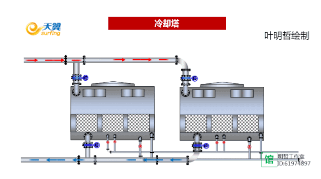 冷却塔有开塔、闭塔,有横流和逆流之分,数据中心冷却塔一般选用钢塔,下图为横流开式钢塔。