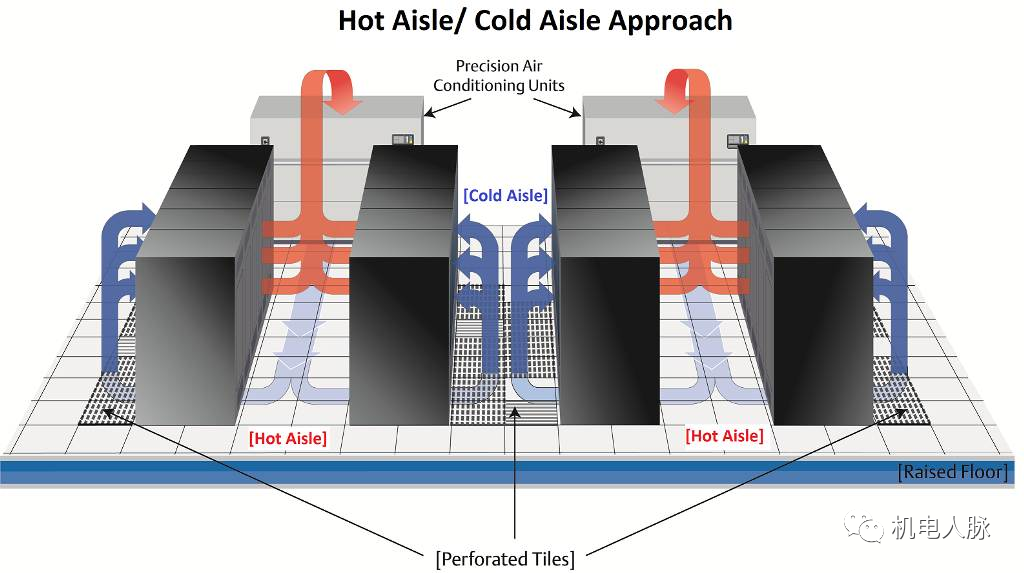 为了优化气流和进一步提升冷却,采用约束送风是比较常用的通风并划分冷池的一种方式,冷热通道分离,如下图。