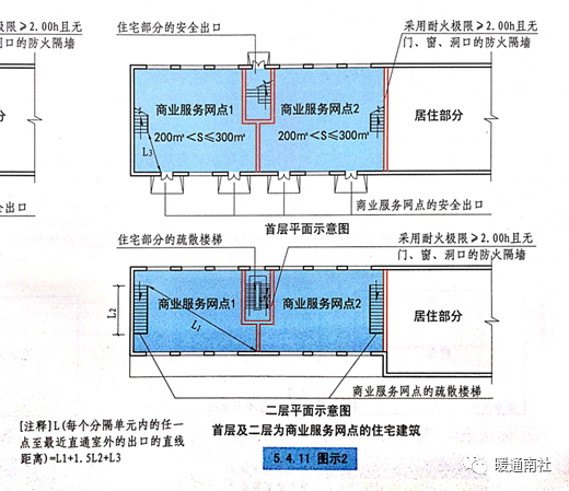5.4.11 设置商业服务网点的住宅建筑,其居住部分与商业服务网点之间应采用耐火极限不低于2.00h且无门、窗、洞口的防火隔墙和1.50h的不燃性楼板完全分隔,住宅部分和商业服务网点部分的安全出口和疏散楼梯应分别独立设置。