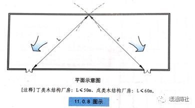 11.0.8 丁、戊类木结构厂房内任意一点至最近安全出口的疏散距离分别不应大于50m和60m,其他安全疏散要求应符合本规范第3.7节的规定。