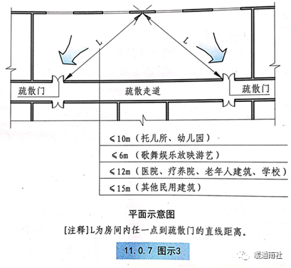 3 房间内任一点至该房间直通疏散走道的疏散门的直线距离,不应大于表11.0.7-1中有关袋形走道两侧或尽端的疏散门至最近安全出口的直线距离。