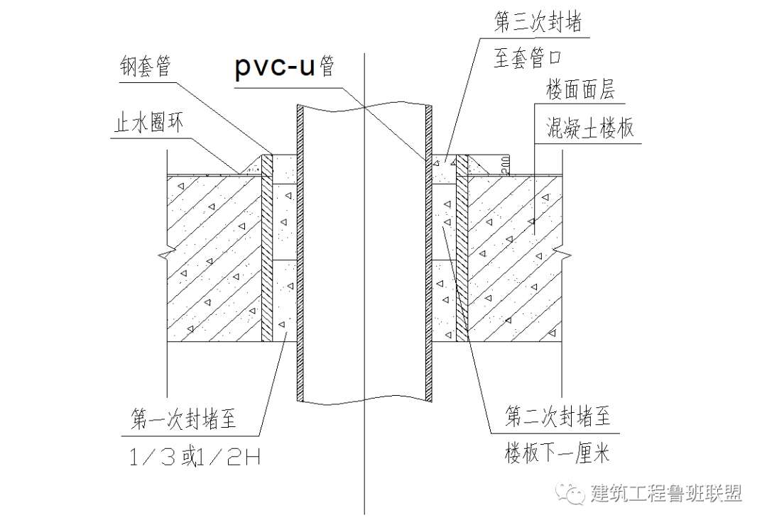 用1:2.5防水水泥砂浆分层嵌填,在穿楼板预留洞口或在楼板钻开的孔内采用二次浇筑细石砼【若PVC管上设止水环则应在第一次浇注2/3H(楼板厚度)细石砼后滑至细石砼面上,然后再进行第二次浇注1/3细石砼,将此环埋在楼板内】。堵洞时要求用钢筋棍将砼振捣密实。然后在管道周围做水泥砂浆阻水圈,间隙处涂以防水油膏则更为可靠,如下图。