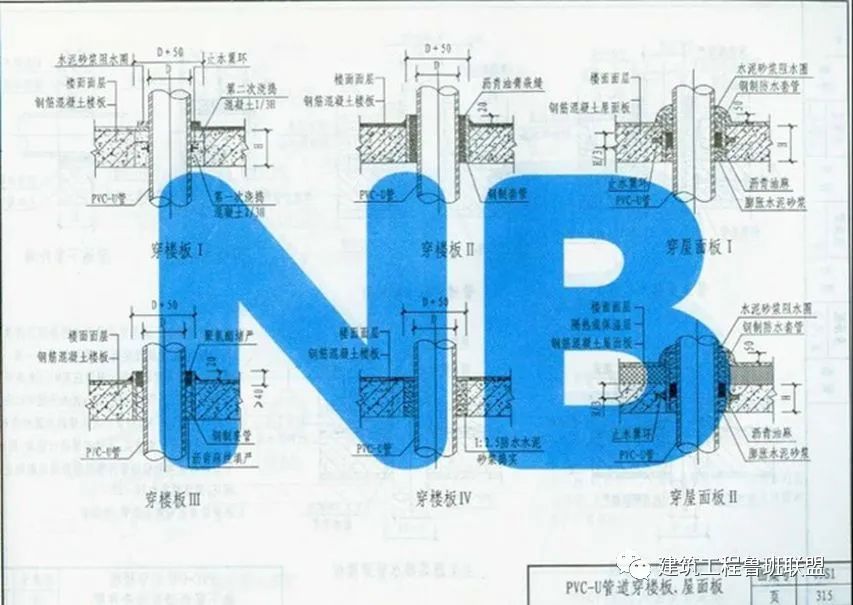 故此,PVC排水管穿越楼板时施工有设置和不设置套管两种做法。标准图集《卫生设备安装工程》(05S1)之(PVC-U管道穿楼板、屋面板)做法也分设置和不设置套管两种做法:
