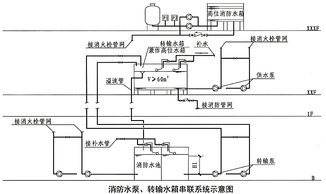 1.当采用消防水泵转输水箱串联时,转输水箱的有效储水容积不应小于60m³,转输水箱可作为高位消防水箱(转输水箱兼作高位水箱,可仍按60m³考虑);