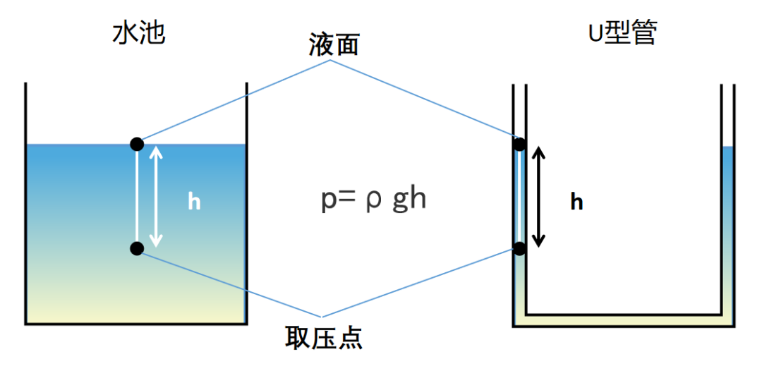 p=ρgh(p是压强,ρ是液体密度,水的密度为103kg/m³,g是重力加速度取9.8N/kg,h是取压点到液面高度)