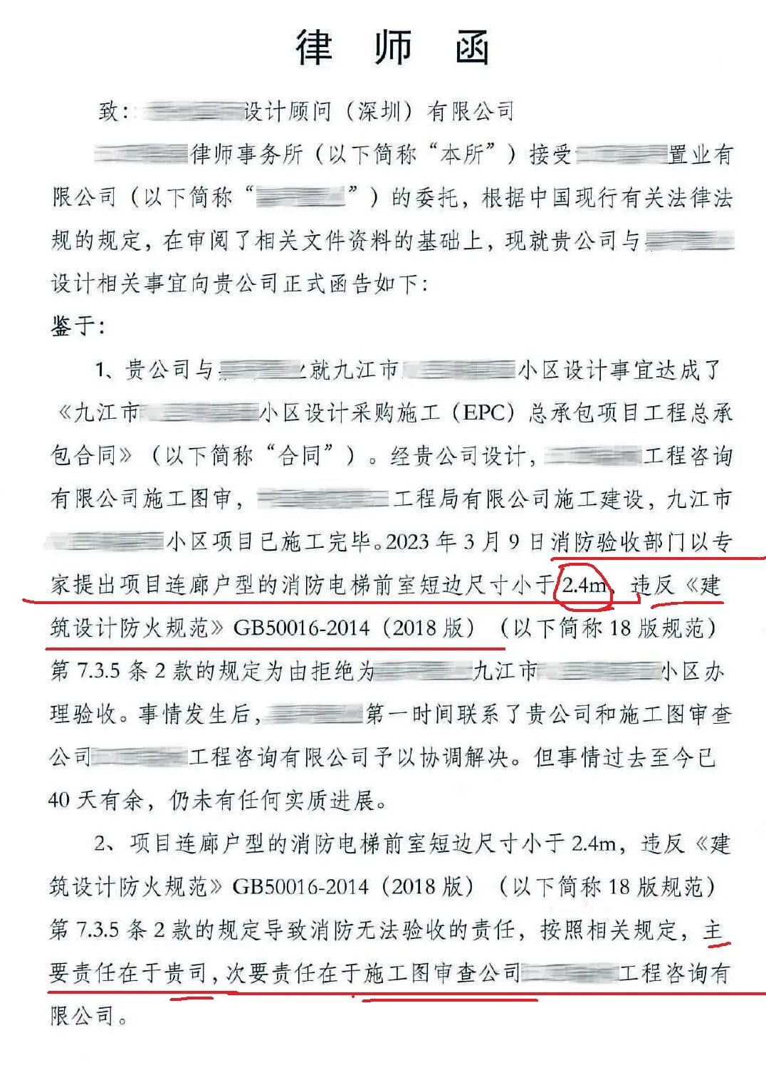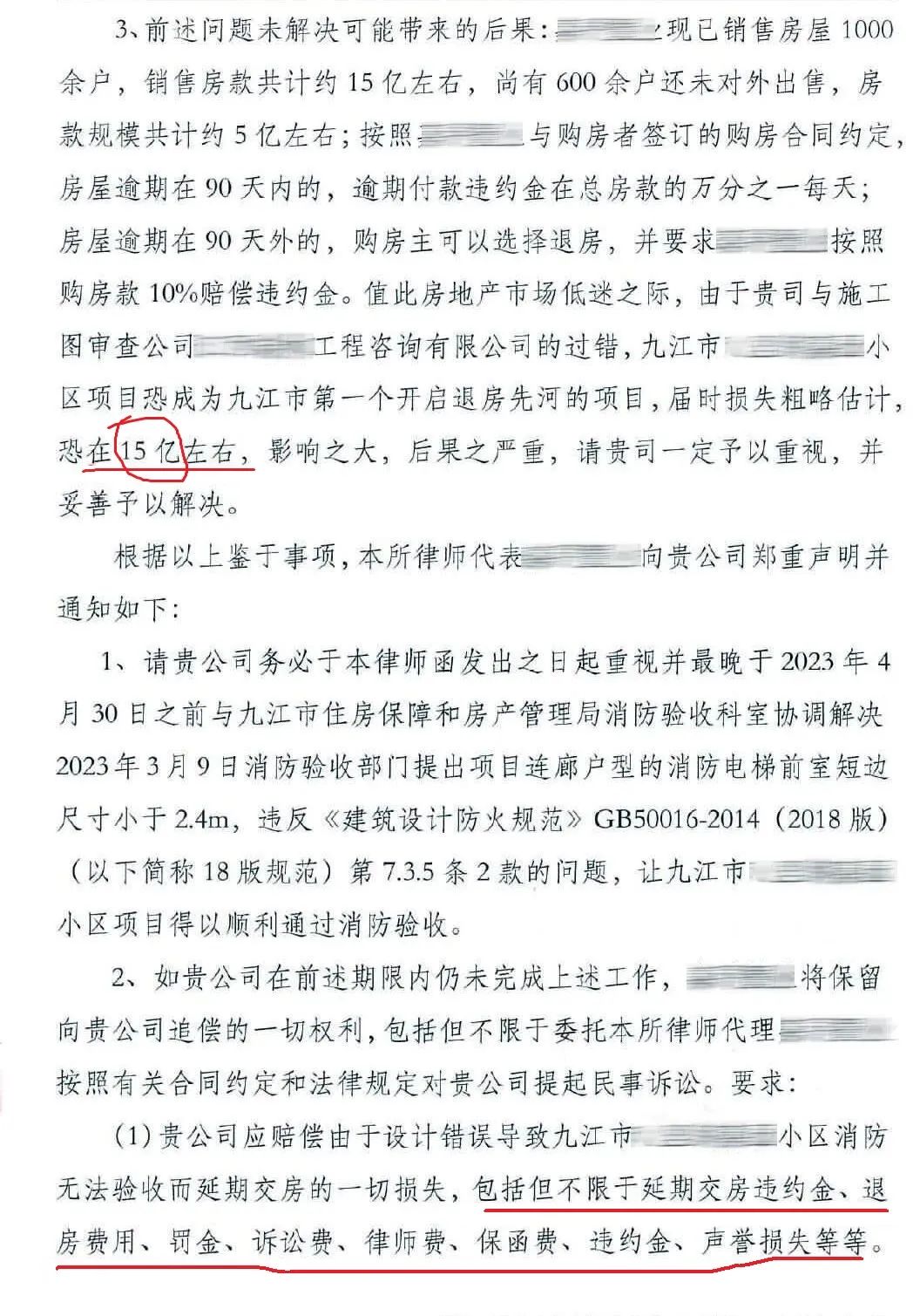 某设计院设计的消防电梯前室短边尺寸小于2.4m(可能装修厚度考虑不足,造成净尺寸略小于2.4m),导致消防无法验收,设计要赔偿开发商一切损失!包括但不限于延期交房违约金、退房费用、罚金、诉讼费、律师费、保函费、违约金、声誉损失等等。给设计院的律师函里说,“届时损失粗略估计恐在15亿左右”。