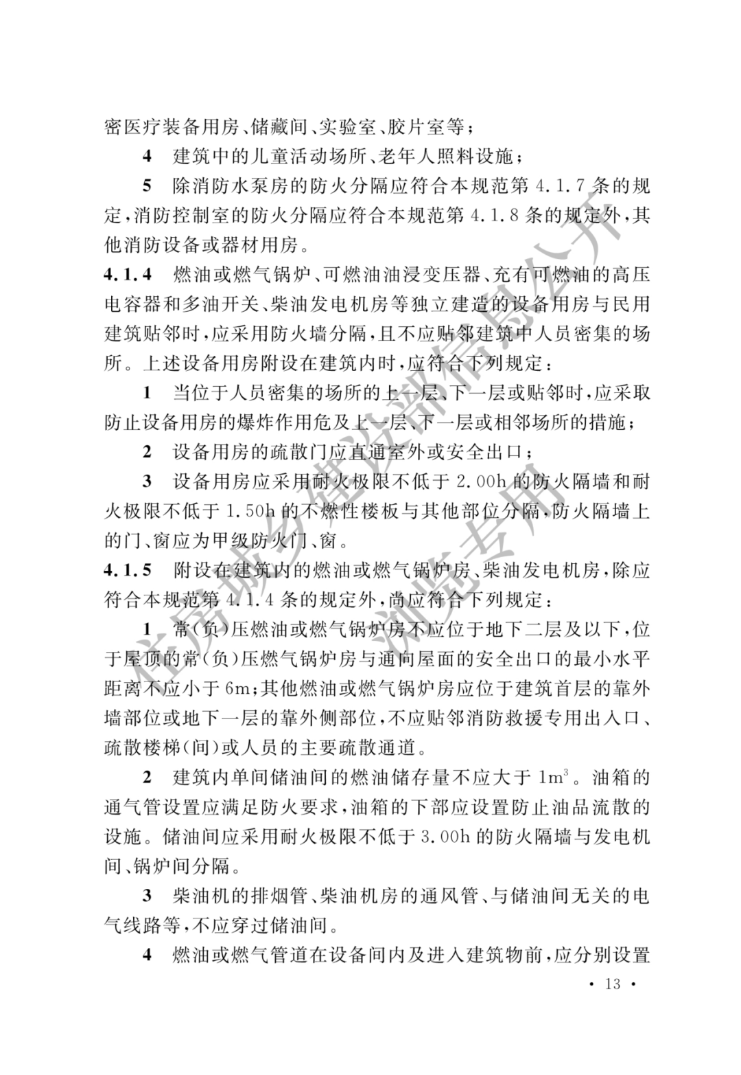 4.1.4 燃油或燃气锅炉、可燃油油浸变压器、充有可燃油的高压电容器和多油开关、柴油发电机房等独立建造的设备用房与民用建筑贴邻时,应采用防火墙分隔,且不应贴邻建筑中人员密集的场所。上述设备用房附设在建筑内时,应符合下列规定:
