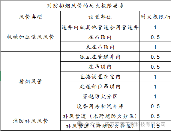 根据《建筑防烟排烟系统技术标准》明确规定了防排烟风管使用的材料和耐火极限。防排烟风管应用不燃材料制作且内部表面光滑,设置在不同部位的风管的耐火极限分别为0.5h、1h、1.5h。