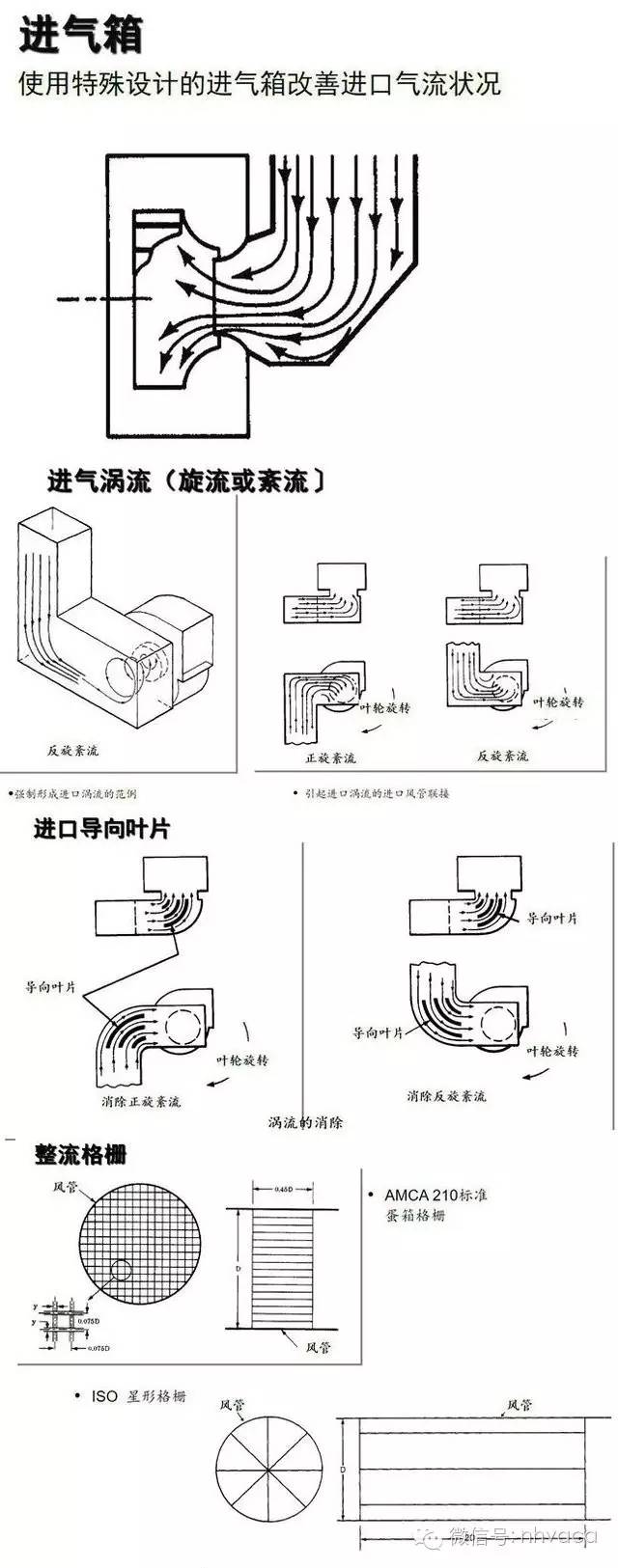 进口风管,进口弯管,进口箱,进口涡流 (旋流或紊流〕,进口导向叶片,整流器,封闭式 (箱形效应〕,有障碍的进口。