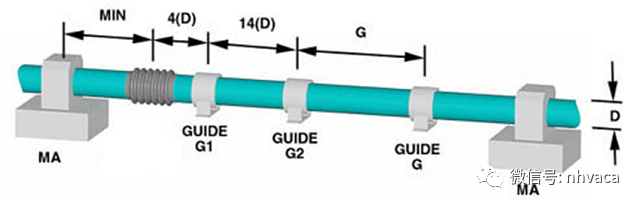 对直管式导向支架进行定位,一般推荐:使补偿器靠近一个固定支架,使第一个导向支架与补偿器端面的间距不超过管径的4倍(L1≤4DN)。这种布设方式既可以使位移得到正确的导向,又可以使补偿器的两端得到适当的支承。第二个导向支架与第一个导向支架的间距不得超过管径的14倍(L2≤14DN)。其它导向支架的最大间距可按公式计算,也可按燃规上的规定执行。如下图所示: