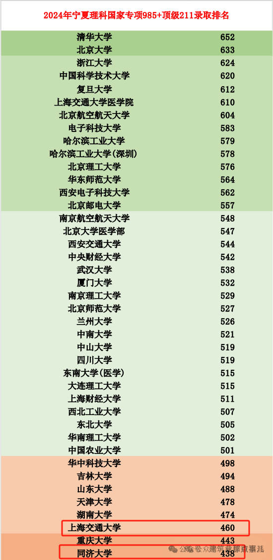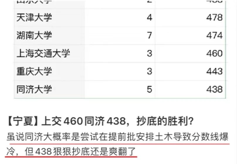 从宁夏国家专项分数排名看,一些传统名校在某些专业上却遭遇了“滑铁卢”。例如,上海交大的环境工程专业仅以460分排名倒数第三,同济大学土建类专业更是以438分垫底。
