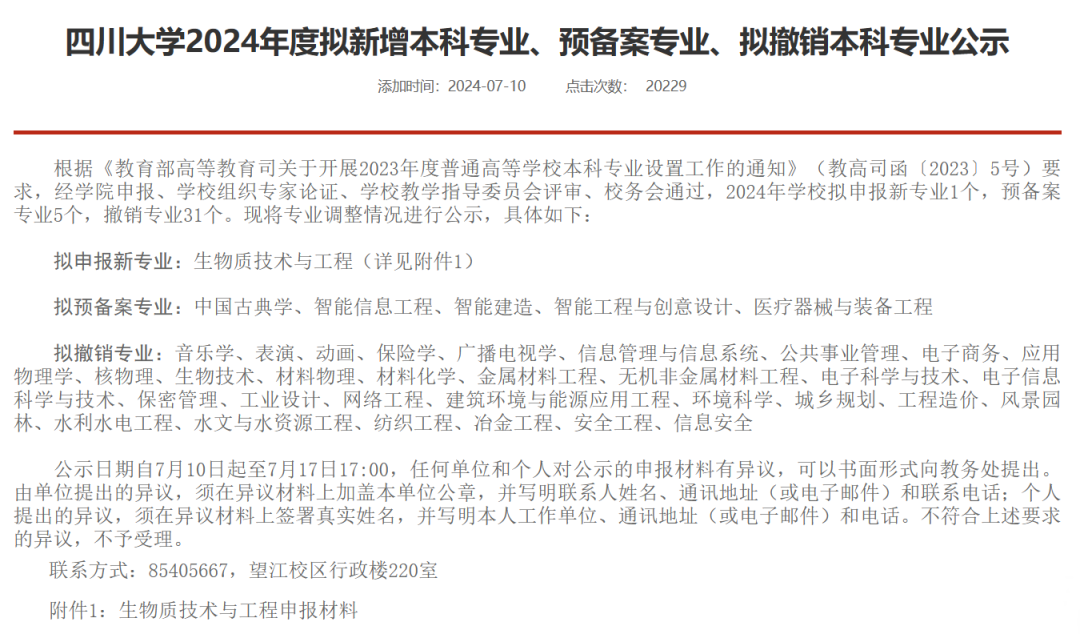 根据《教育部高等教育司关于开展2024年度普通高等学校本科专业设置工作的通知》文件要求,经充分征求各教学单位意见,拟撤销音乐学等9个本科专业(见附表),现予以公示。