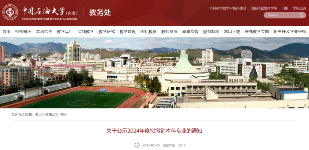 8月20日,中国石油大学(北京)教务处发布了《关于公示2024年度拟撤销本科专业的通知》,拟撤销建筑学等9个专业。