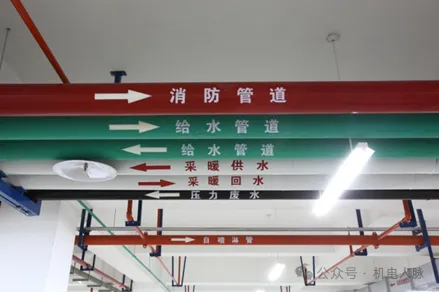 5)所有的文字和箭头一律标识在醒目位置,管道标识应从设备的管接头、阀体上方醒目处开始标注,应涂制在所有管道交叉点以及桥架三通处,当管道或桥架穿墙、穿楼板时应在离墙或楼板上方1m左右标识。
