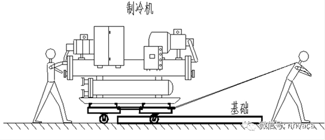 2、吊车将制冷机组吊到小车上,然后采用人工拖行方式,将机组拖入设备安装处。拖行如下图:
