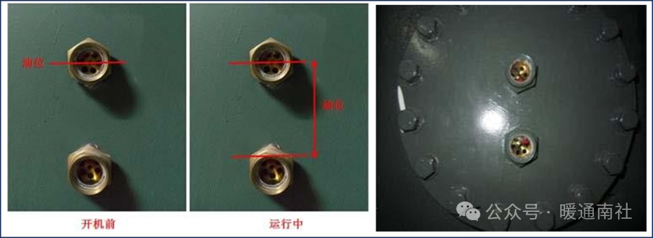 通过压缩机上的视油镜进行观察(若光线不足或有彩光干扰,使用电筒),正常的润滑油应为浅 黄色的透明清亮,随着运行时间加长会略微加深,运行时有少量气泡属于正常现象,但不应有固态颗粒或 其他杂质。