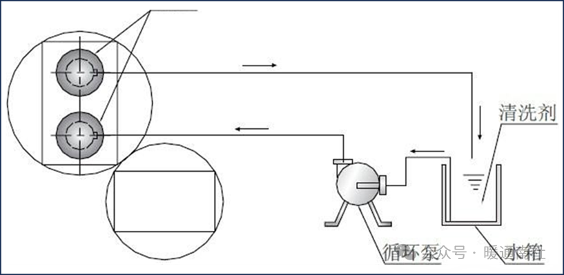 现场壳管端温差大于5℃,则属于结垢严重,物理通炮不理想的情况下,采取化学清洗。连接水泵→粘泥剥离→主洗除垢→漂洗→预膜钝化。
