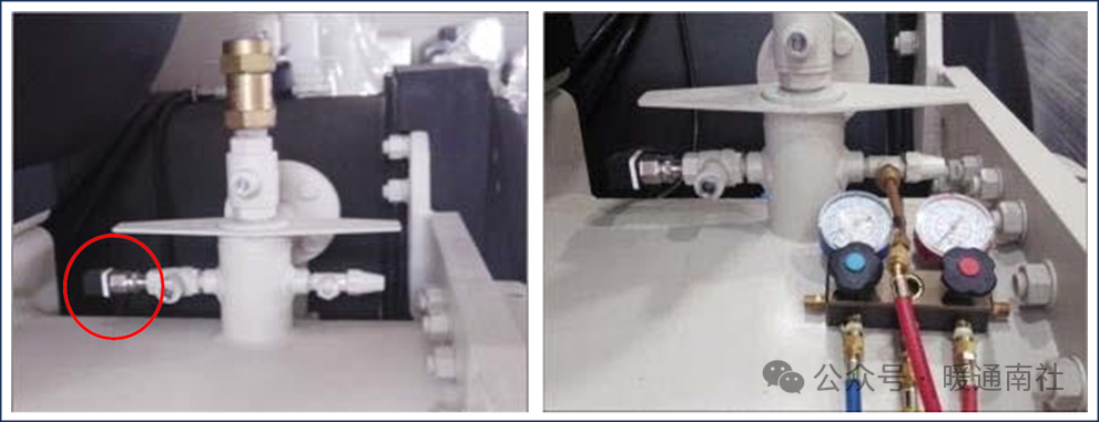 在压力传感器位置附近的注氟嘴上连接压力表。