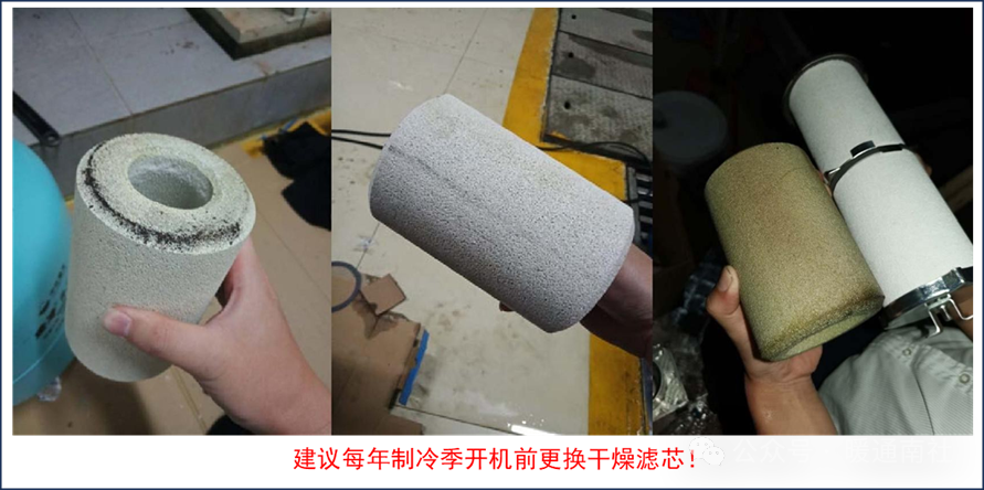 制冷系统中过滤器的清洗和干燥剂的更换对保证系统中制冷剂的正常循环,达到制冷的目的是十分重要的。由于水与制冷剂有可能产生冰塞,而制冷剂中的机械杂质又会加快设备的磨损。因此,保持制冷系统内的制冷剂的干燥和清洁是必要的。