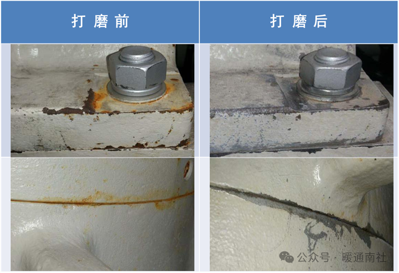 使用200目的砂纸对碰伤、生锈处打磨;平面打磨需要超出生锈部位10mm以上;缝隙打磨需要超出缝隙周边5mm以上。