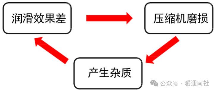 润滑效果差而不及时更换润滑油,将会加剧压缩机运行时的磨损,从而进入一个恶性循环状态。