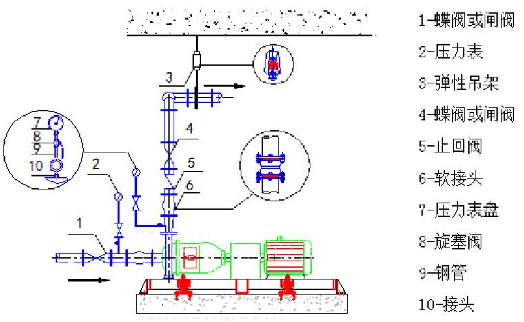2立式水泵不得采用弹簧减震器;大型立式水泵最好采用稳定性好的橡胶减震垫;多台立式泵可采取组合机组安装,增加水泵的整体稳定性