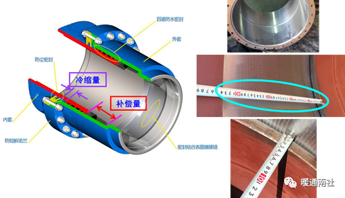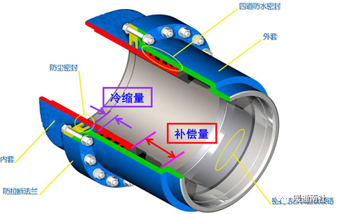 压盖式补偿器主要结构如下:其结构内部包括,紧固、冷缩量、补偿量等。