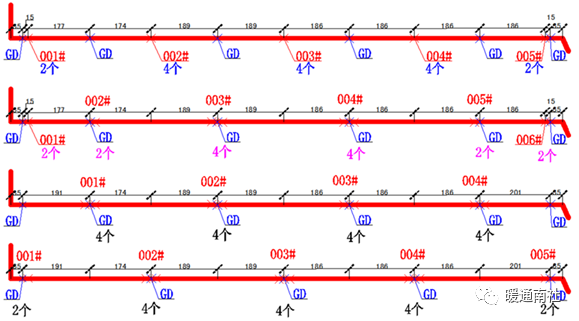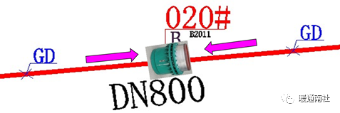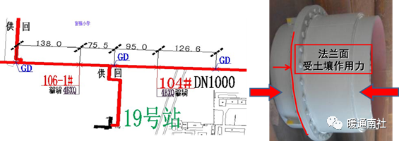 图中106#和104#在井内,可安装单向和双向。如果安装单向则尽量不要直埋。因为单向无论怎样安装,因为管道挠性和受力不均等情况也影响补偿器的正常工作。如果是直埋安装,还增加了土壤对外套法兰有阻挡作用,使补偿器外套端的正常热运动受影响。如下图所示的位置若为直埋敷设,最好选择安装双向补偿器,且尽可能安装在固定墩中间位置。即使选择双向补偿器,管道挠性、受力不均、补偿量不一致等影响因素依然存在。