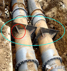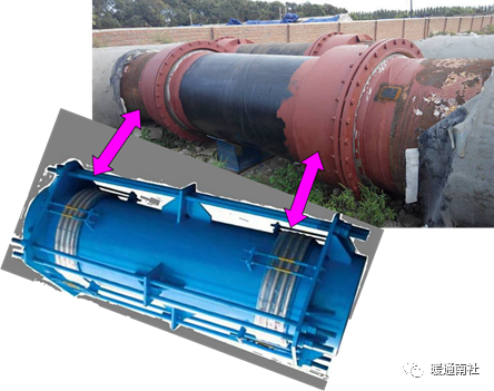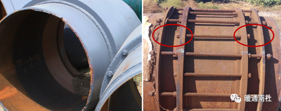 如果补偿器是直埋敷设,一般要将补偿器的外套端焊接到固定墩侧,让补偿器的芯管作为活动端往复动作。如果安装反了,外套端作为活动端,外套的法兰面要克服土壤阻力运动相对较为困难,不利于管道正常伸缩,影响补偿器的正常使用。所以,对固定墩同一侧的补偿器来讲,两个补偿器沿两根管线的中心线是对称安装,不能相反。