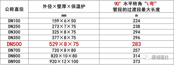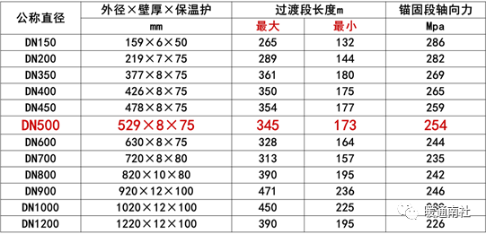 在循环温度130℃,安装温度0℃,管顶覆土1米,管道压力1.6MPa等大量条件下,不同管道的过渡段长度见下表:
