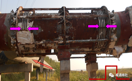 在故障发生后,没有确定是设计原因还是设备原因。从理论上来讲,设计没有问题,但后来该处补偿器移位安装时,设计单位将固定支座,改为了滑动管支座。