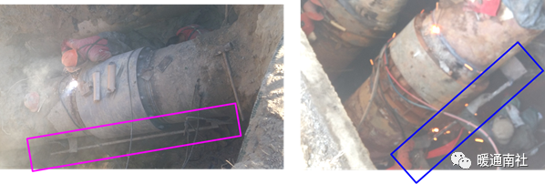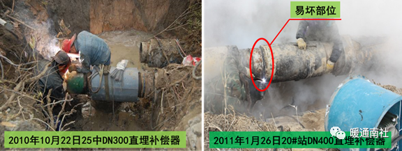 直埋波纹管补偿器发生故障的问题常位于环形板与管道的连接部位,波纹节疲劳裂缝,根据渗漏情况、室外气温、抢修预计时间,如果在气温较低的情况下,一般采取补焊和打套袖的方式进行暂时处理,以维持正常供暖,待采暖期结束后进行彻底更换。如果气温比较高、管径较小、维修时间短,一般则采取暂停供暖、更新补偿器,彻底解决隐患。