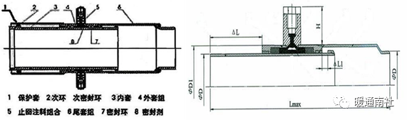 该的密封方式是用密封胶条、聚四氟乙烯等为材料,通过法兰压紧的方式实现密封,图中的黑色密封圈和法兰压盖,类似于阀门的盘根和压盖结构。其特点能够用于直埋,渗漏紧固维修方便。其结构如下:
