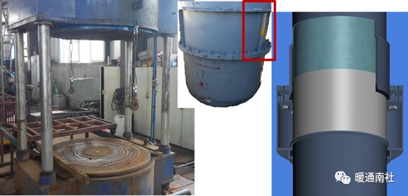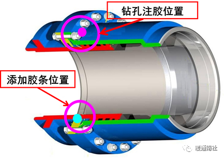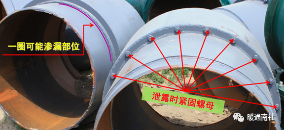 渗漏位于芯管和外套之间的法兰处。通过紧固螺栓,挤压密封圈,实现封堵的目的。