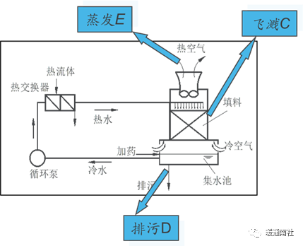 蒸发损失水量(E);飞溅损失水量(C);定期排放水量损失(D)。
