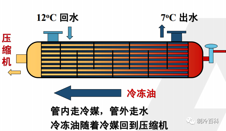 干式蒸发器制冷剂在换热管内通过,冷水在高效换热管外运行,这样的换热器换热效率相对较低,[本文来源:制冷百科公众号],其换热系数仅为光管换热系数的2倍左右,但是其优点是便于回油,控制较为简便,而制冷剂的充注量大约是满液式机组充注量的1/2~1/3左右。