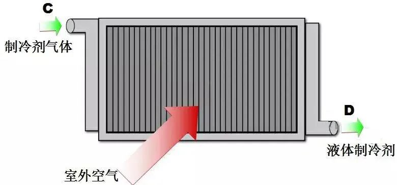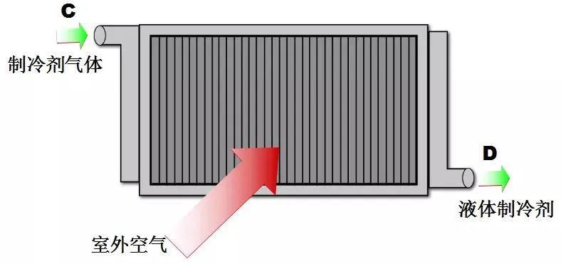 冷凝器将热量传递到外界环境,制冷剂气体冷却液化,使外界环境温度升高。