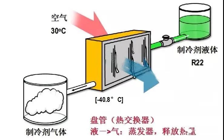 蒸发过程:从节流装置流出来的制冷剂液体流向蒸发器,吸收外界(空气或水)的热量而蒸发成为气体,从而使外界(空气或水)的温度降低,蒸发后的低温低压气体被压缩机吸入。