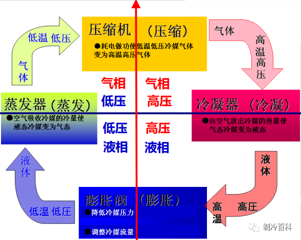 ④节流过程:高压液体降低压力重新变为低压液体,返回到①从而完成循环。