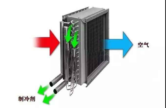 冷凝器:输出热量的设备,将制冷剂在蒸发器中吸收的热量和压缩机消耗功所转化的热量排放给冷却介质。