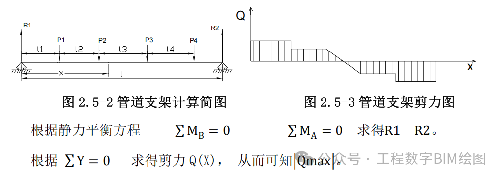 支架承担的荷载为:两相邻支架间距中心之间的各管道荷载,当支架等间距时,等于两支架之间的荷载。根据静力平衡求得管道支架的反支力 R1、R2。管道支架示意图如图 2.5-1 所示,管道支架受力如图 2.5-2 所示,管道支架所受剪力及弯矩如图 2.5-3、2.5-4 所示。
