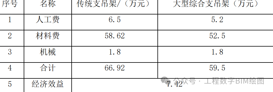 经过综合测算该工法在广场项目上的支吊架安装应用直接经济效益达 7.42 万元。经济效益见表: