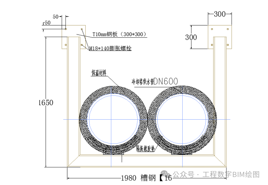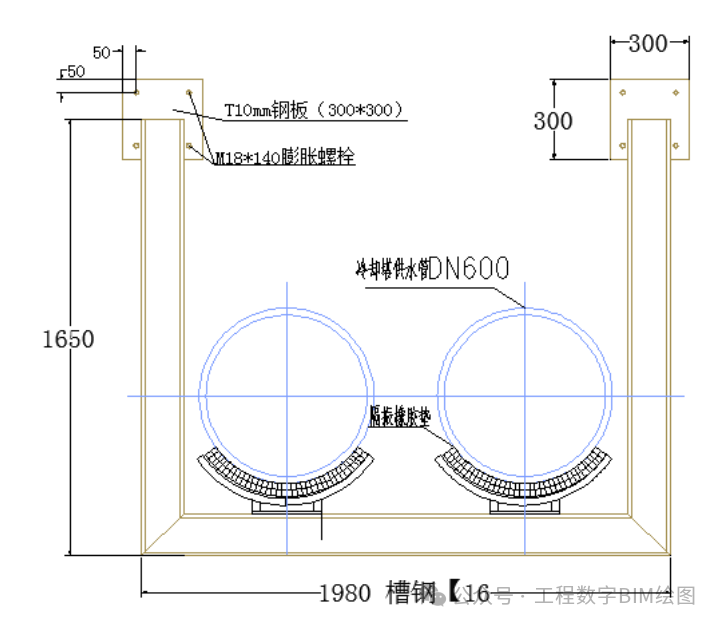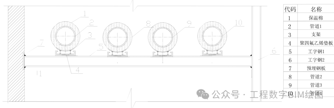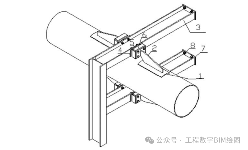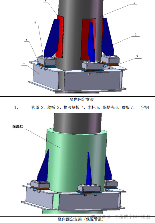 图一所示管道与梁通过弧形腹板→肋板→保护壳→木托→橡胶板→工字钢相连。