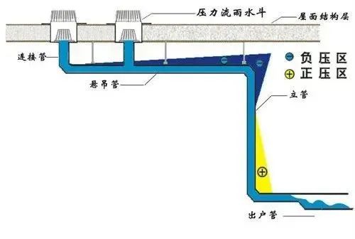 利用屋面与地面高差产生的能量,在屋面积水达到一定高度时,使得管道内不进入空气,以满管流状态(即虹吸状态)排水时产生负压,管道内形成抽吸作用将雨水迅速排掉。