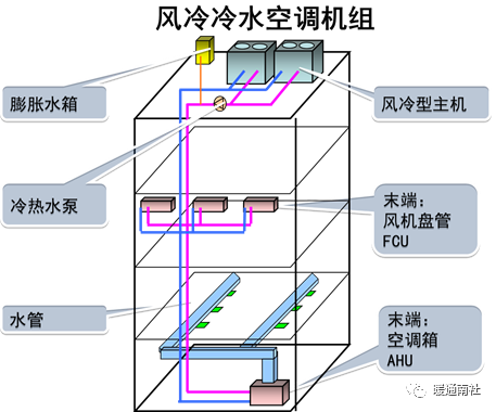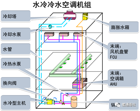 冷水——产出冷水,向循环冷冻水排冷,冷媒只在主机循环。