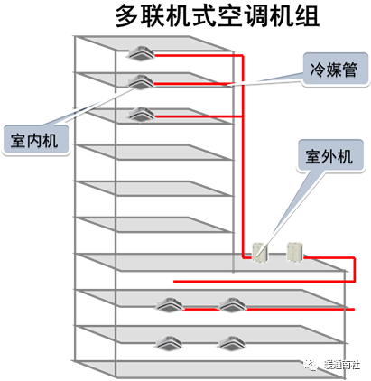 一台室外机或多台组合后通过一组铜管向若干个室内机输送制冷剂,可制冷制热。