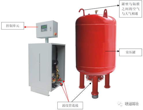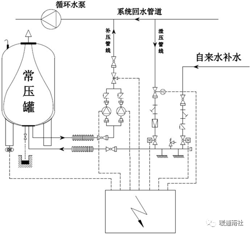 补压管线:系统压力过低由水泵启动吸取常压罐中水源提供给系统,进行补压。